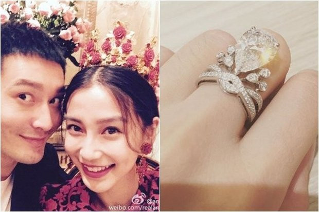 Tín vật đính ước của Angela Baby và Huỳnh Hiểu Minh là chiếc nhẫn mang thương hiệu Chaumet Josephine với một viên kim cương lớn 5,53 carat ở giữa cùng 73 viên kim cương nhỏ được viền xung quanh, ước tính có giá trị lên đến 35 tỷ đồng.