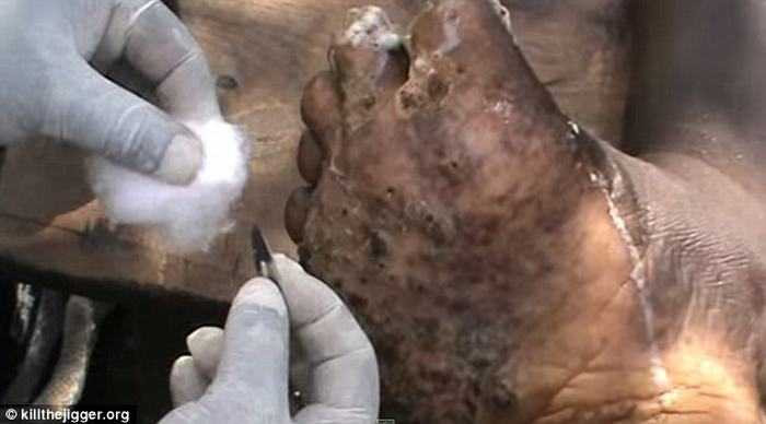 Chân của người đàn ông này đã bị bọ jigger (có tên khoa học là Tunga penetrans, một loại côn trùng giống bọ chét) làm tổ trong nhiều năm khiến nó sưng, biến dạng và làm ông không thể đi lại được.
