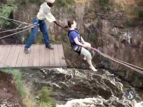 Trò chơi nhảy dây tại thác Victoria, Zimbabwe trên sông Zambezi khiến người phụ nữ đắn đo, sợ hãi khi thực hiện.