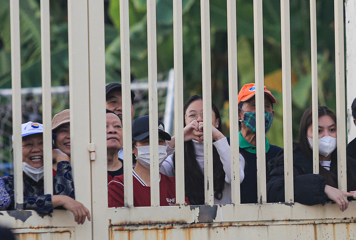 Không được vào khán đài, họ quyết định đứng ở cửa sắt lớn gần nhất với khu vực đội tuyển Việt Nam khởi động. Cổ động viên dành nhiều tình cảm cho Nguyễn Xuân Son cùng đồng đội.