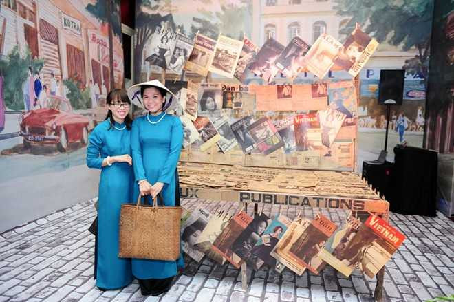 Hình ảnh thiếu nữ Sài thành ngày trước cũng xuất hiện sinh động trong không gian cưới của cô dâu Ngân Khánh. Ê-kíp cũng thiết kế một sạp báo với những trang bìa là hình cô dâu Ngân Khánh. Những tấm thiệp cưới cũ kỹ giống như tờ nhật báo cũng được phơi bày trên sạp.
