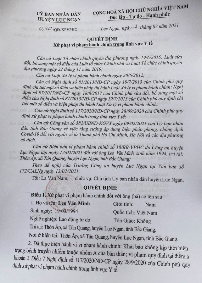 Chiều 13/2, Ông La Văn Nam, Chủ tịch UBND huyện Lục Ngạn (Bắc Giang) cho biết, đơn vị vừa ban hành quyết định xử phạt vi phạm hành chính đối với anh Leo Văn Minh (SN 1994) ở thôn Áp, xã Tân Quang về hành vi "khai báo không kịp thời hiện trạng bệnh truyền nhiễm thuộc nhóm A của bản thân" mức phạt 10 triệu đồng.
