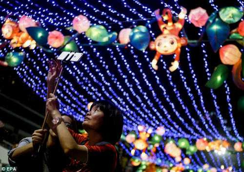 | Mọi người chụp ảnh dưới ánh đèn trang trí ở Hong Kong. |