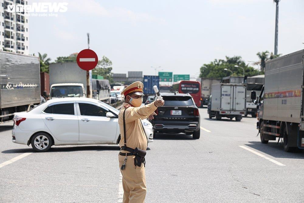 Lực lượng CSGT làm nhiệm vụ tại chốt ở khu vực cầu Phù Đổng (cao tốc Hà Nội - Lạng Sơn chạy qua huyện Gia Lâm).