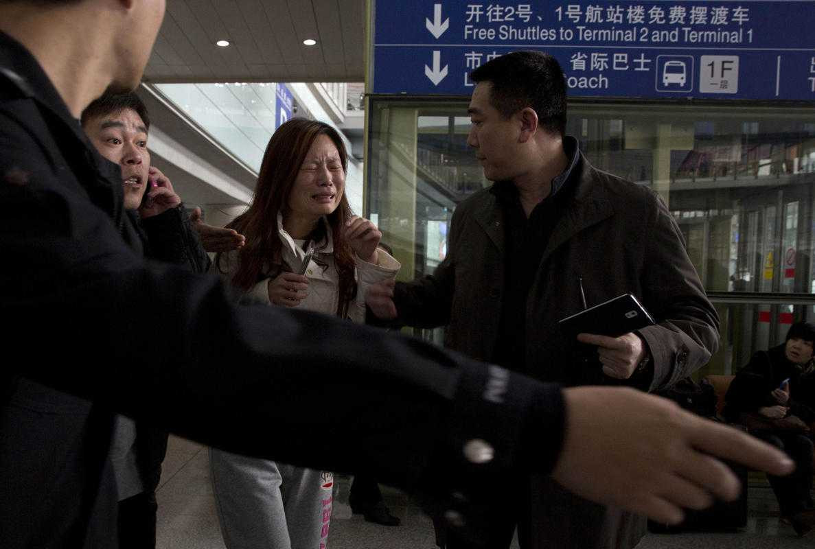 Một phụ nữ trẻ tại sân bay Bắc Kinh òa khóc khi nghe tin máy bay mất tích
