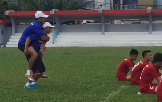 Với không khí vui vẻ, vào cuối buổi tập sáng nay 8/6, như để tiếp thêm hưng phấn cho các cậu học trò, hai trợ lý HLV Dương Minh Ninh và Võ Văn Hạnh thực hiện bài tập không thể nhịn được cười.