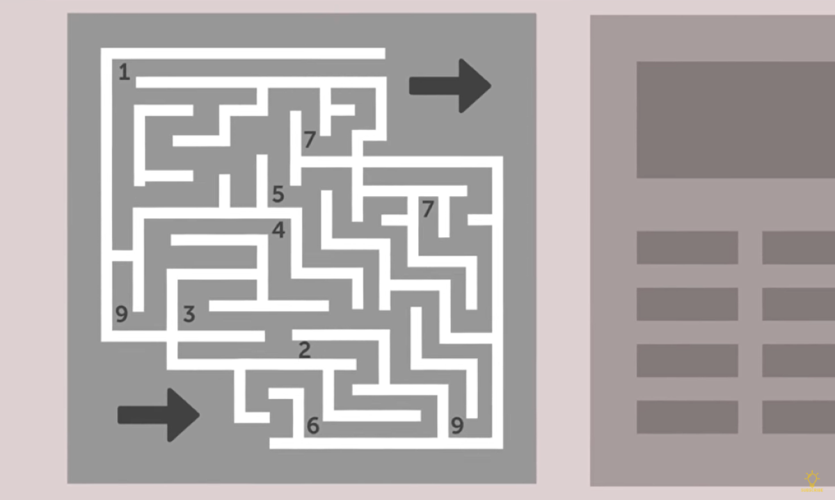 Giả sử bạn đi lạc vào mê cung từ hướng mũi tên phía dưới. Trong đó, bạn sẽ phải đi chính xác và thu thập các con số mà mình đi qua để tìm ra mật mã của cánh cửa ở mũi tên phía bên trên. Các chữ số trong mê cùng này gồm: 1, 2, 3, 4, 5, 6, 7, 9.
