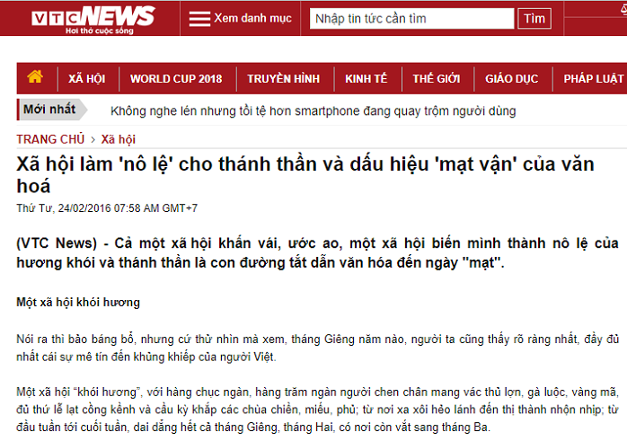 Có lần, sau khi phóng viên được cử đi phản ánh các lễ hội lớn đầu năm, và mang về hình ảnh, clip đâu đâu cũng thấy những người là người, nghi ngút khói hương, sì sụp khấn vái, cầu ước; con người đối xử với nhau như kẻ thù, hỗn chiến dã man bằng nắm đấm, gậy gộc, hung hăng và cả máu để cướp lộc với mong muốn may mắn, ăn nên làm ra, rồi cả …đẻ con trai, Tổng biên tập nói “cần một bài viết phê phán tình trạng này’’.