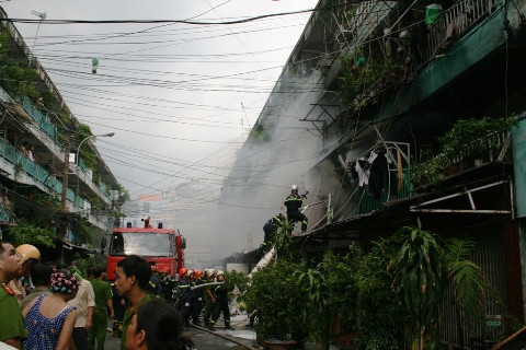 Lửa xuất phát từ căn nhà khoá trái cửa nằm ở lô V, khu chung cư Ngô Gia Tự Khói đen bốc lên mù mịt Các chiến sĩ PCCC bắc thang tiếp cận nơi xảy ra cháy Vụ cháy khiến khu dân cư náo loạn