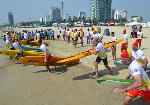| Cuộc thi cứu hộ biển tổ chức sáng 1/5 tại công viên biển Đông, Đà Nẵng, thu hút nhiều du khách trong và ngoài nước tham gia. Ảnh: Nguyễn Đông. |