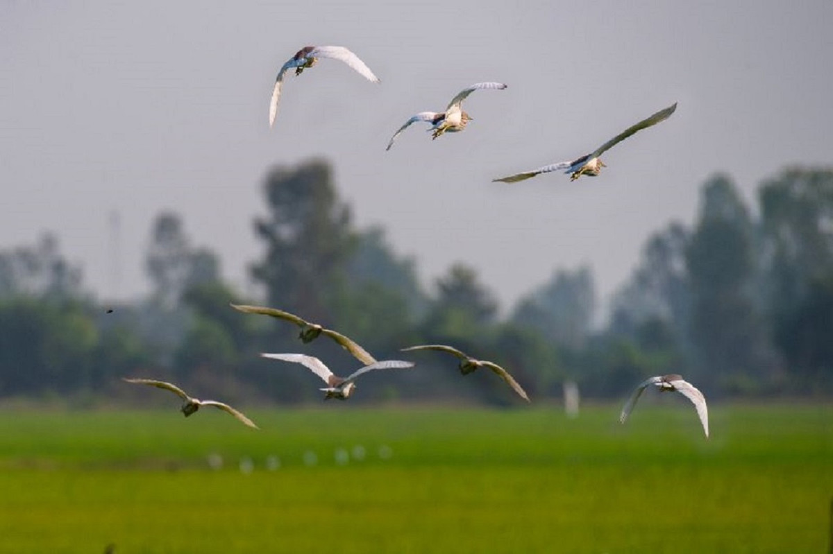 Từ đài quan sát, bạn có thể nhìn ngắm đàn cò trắng phau sải cánh bay lượn trên cánh đồng.