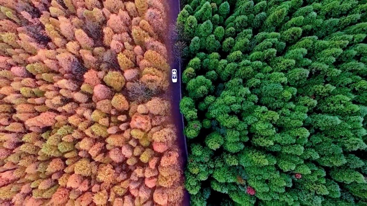 Khu rừng hai màu xanh, đỏ bao phủ ngọn núi ở Trung Quốc