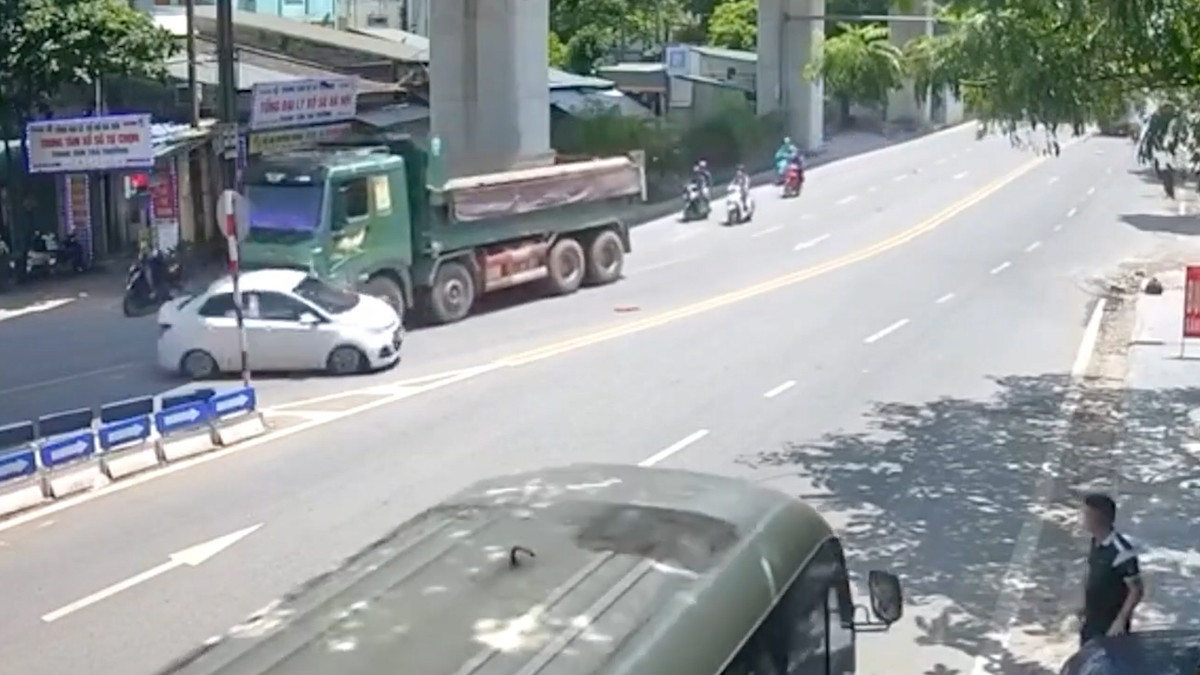 Tài xế xe ben bị khuất tầm nhìn đã húc văng ô tô con vào dải phân cách tại đường Ba La, quận Hà Đông, Hà Nội.