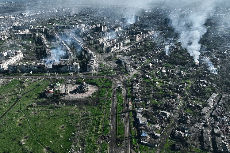 Binh sĩ Ukraine sử dụng UAV ghi lại khung cảnh TP Bakhmut ở phía Bắc Donetsk bị phá hủy gần như hoàn toàn sau những cuộc giao tranh ác liệt giữa Nga và Ukraine.