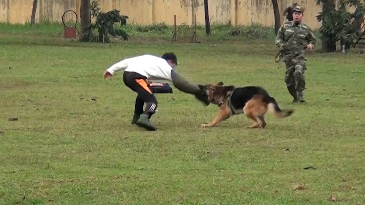 Vượt chướng ngại vật, nhảy qua lửa, khống chế tội phạm… là những bài tập của khuyển binh (chó nghiệp vụ) tại Trường Trung cấp 24 Biên phòng.