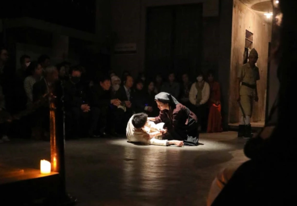 Hoạt cảnh trong "Đêm thiêng liêng 3: Lửa thanh xuân" - tour trải nghiệm giúp nhóm tác giả từ Di tích Nhà tù Hỏa Lò đoạt giải năm 2023 về sáng kiến, sản phẩm có giá trị thông tin đối ngoại. (Ảnh: Thanh Tùng/TTXVN)