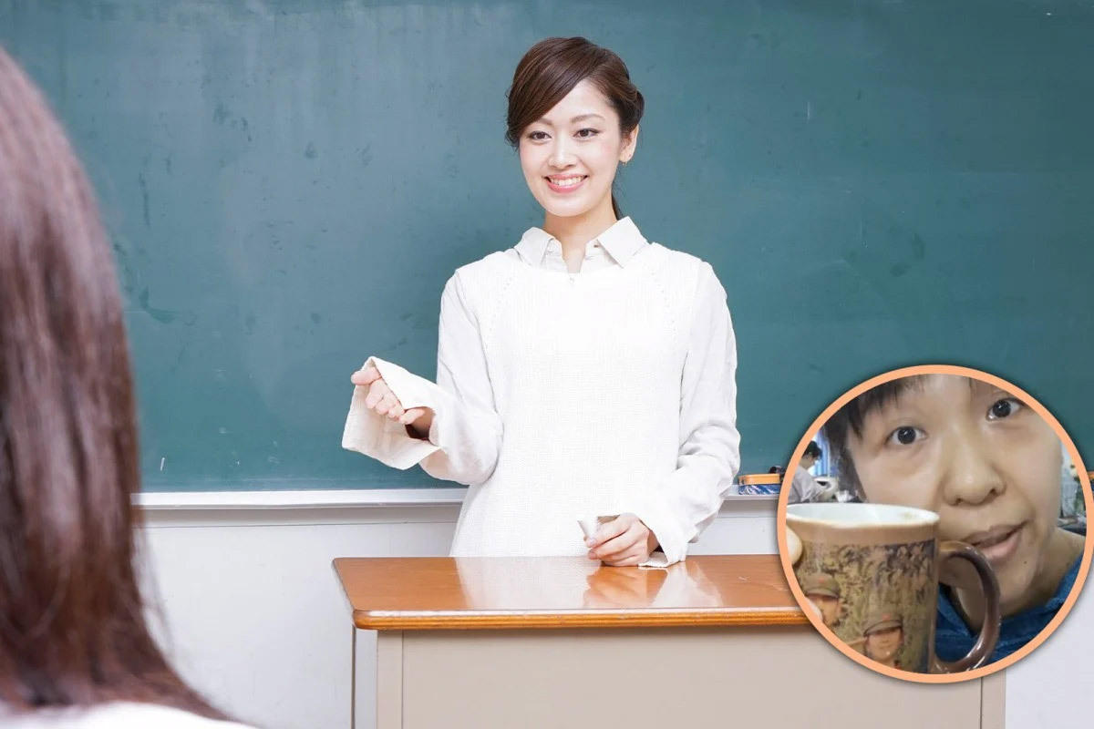 Cô giáo Chu giơ cốc cà phê để giải thích cho các em về việc hãy sống thực tế và biết cách chấp nhận thất bại.