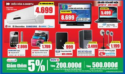 Quý khách đang cần mua các sản phẩm công nghệ, laptop 14” – CPU 2 nhân, ram 2GB có mức giá cực shock 5,499 triệu; máy bộ Trần Anh CPU: G550, ram 2GB, giá khai trương 3,499 triệu, điện thoại Samsung S5830 tặng thẻ nhớ 4G có giá chỉ 2,999 triệu; máy ảnh Canon A2300 tặng thẻ 4G + bao da, giá chỉ 1,799 triêu là sự lựa chọn hợp lý về giá cả và chất lượng. Ngoài ra, còn hàng trăm sản phẩm khuyến mại đến 49% tại các ngành hàng.