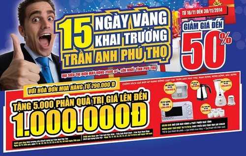 Nhân dịp khai trương, Trần Anh Phú Thọ tặng Quý khách hàng 15 ngày vàng ưu đãi với hàng loạt sản phẩm đang được bán ra với mức giá cực kỹ hấp dẫn như: tivi Sharp 32” giá 4,399,000đ tặng nồi đất tiện dụng, máy giặt lồng đứng Toshiba giá khai trương 3,799,000đ, lò vi sóng có nướng Sanyo giá sốc 1,399,000đ.
