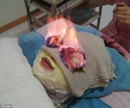 (VTC News) - Một số spa ở Trung Quốc dùng một tấm khăn nhúng vào cồn và một thứ rượu thuốc rồi đặt lên da mặt, da lưng trước khi châm lửa đốt, ngọn lửa nhanh chóng cháy bùng bùng trên khu vực có cồn.