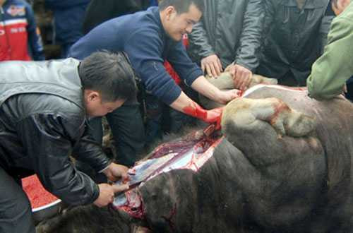 Chọc tiết xong, những đồ tể này dùng nhiều ống nhựa dẫn nước to bằng ngón tay, phía đầu được cắm chiếc kim tiêm loại lớn, đâm kim tiêm vào cổ họng bò, có con đâm thẳng vào động mạch để “ăn nước”. Con bò lúc đầu gầy guộc, nhưng được "ăn nước", nên con nào, con nấy béo căng.