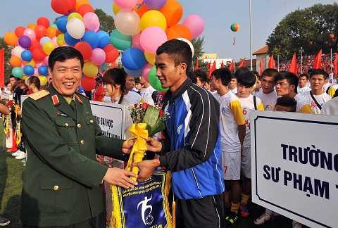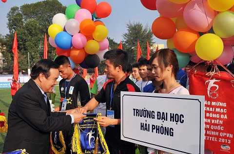 | Thứ trưởng Bộ GDĐT Trần Quang Quý tặng hoa cho các cầu thủ |