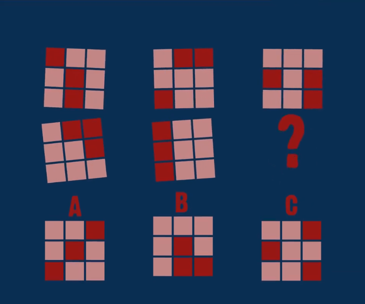Hình nào còn thiếu ở vị trí dấu chấm hỏi? A, B hay C?
