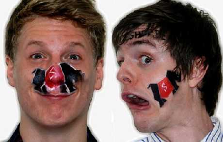 Nhiều logo được dán lên mặt 2 chàng trai