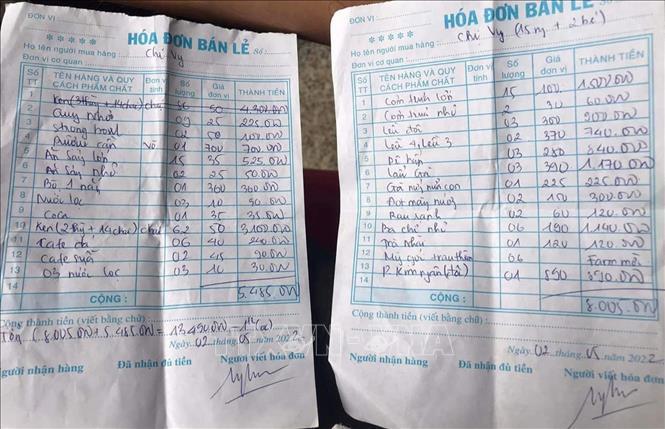 Hai phiếu tính tiền được du khách đăng tải trên mạng xã hội phản ánh một số dịch vụ ăn uống với giá cao. Ảnh: TTXVN phát