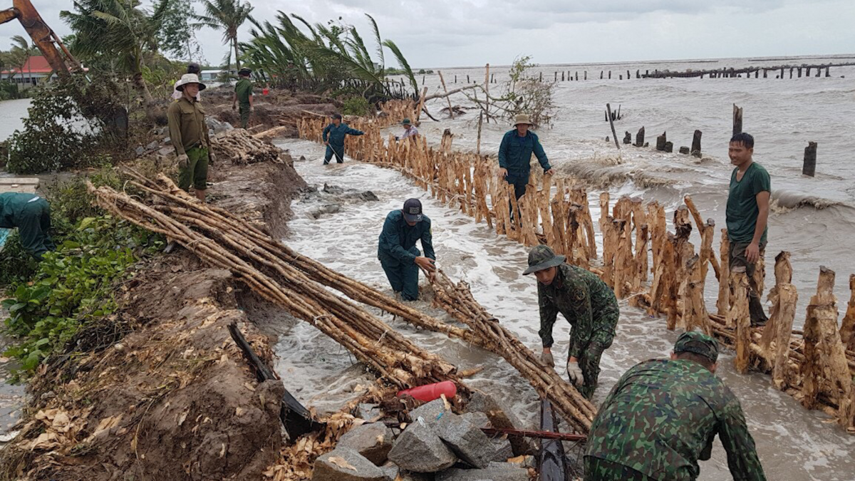 Ban CHQS huyện An Minh, tỉnh Kiên Giang huy động hàng trăm cán bộ, chiến sĩ khắc phục 2 đoạn đê Quốc phòng dài trên 70m, bị sạt lở do mưa lớn.