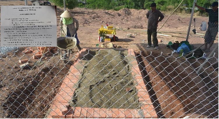 Do chính quyền không cho xây mộ tạm kiên cố bằng xi măng nên con cháu Nguyễn Phước tộc đành xếp gạch, đổ cát làm mộ tạm để bảo vệ mộ bà Cửu giai Tài nhân họ Lê tại vị trí cũ. (Ảnh: Nguyễn Vương)
