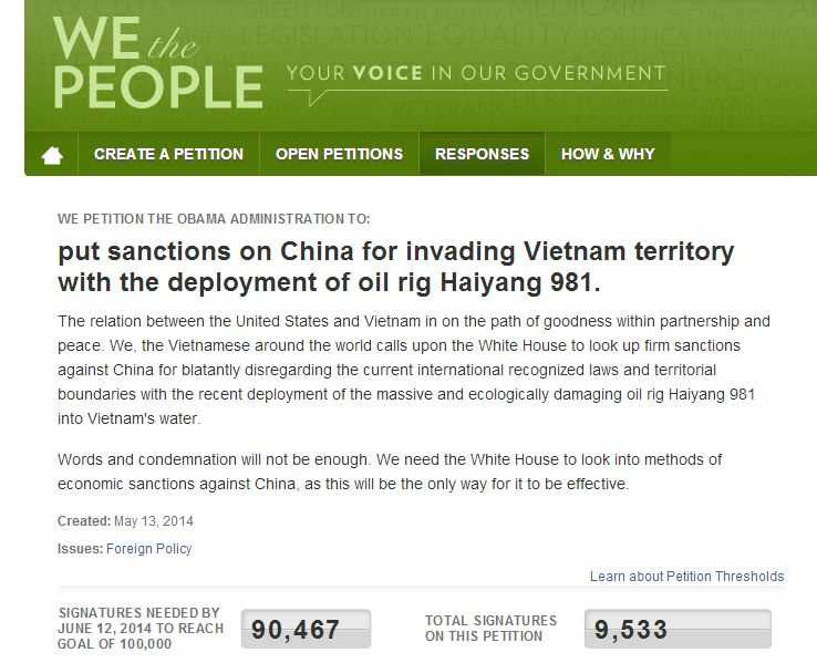 Ngày 13/5, trên website của Nhà Trắng xuất hiện bản kiến nghị yêu cầu chính quyền Obama trừng phạt Trung Quốc về việc nước này hạ đặt giàn khoan Hải Dương 981 trái phép tại vùng đặc quyền kinh tế và thềm lục địa của Việt Nam.