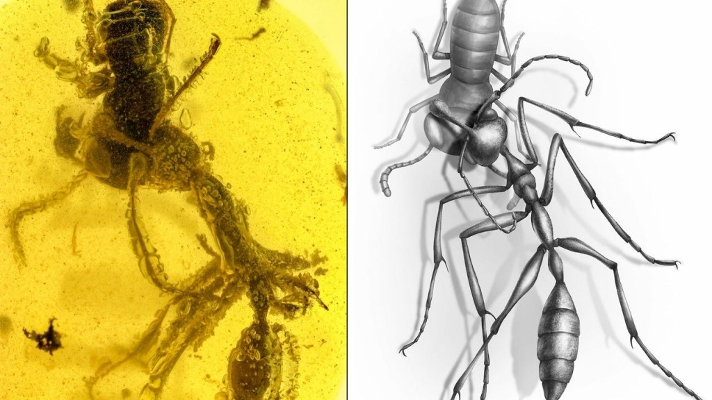 Miếng hổ phách 99 triệu năm tuổi được khai quật tại Myanmar, chứa một con kiến Ceratomyrmex ellenbergeri đang tóm gọn một sinh vật là họ hàng của loài gián bằng những chiếc răng hàm giống như lưỡi hái của nó.