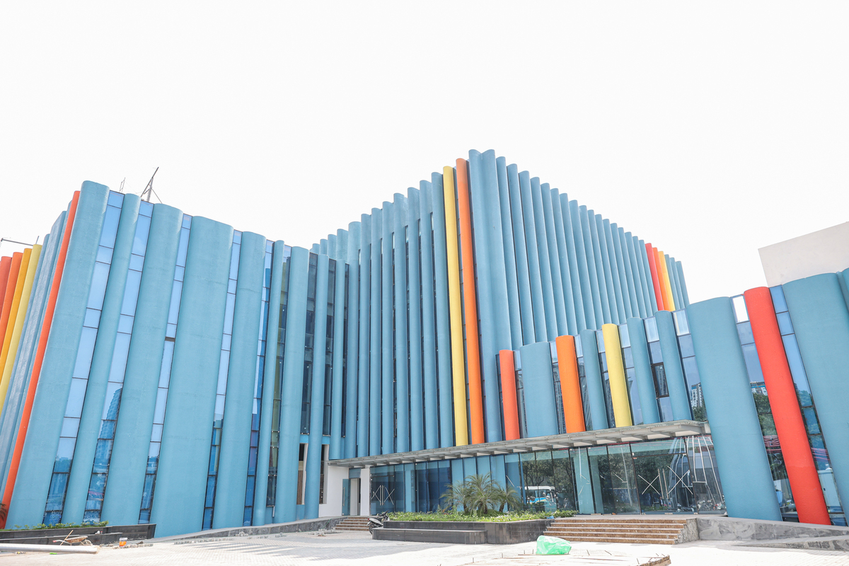 Quan sát từ bên ngoài, công trình gây ấn tượng với tông màu xanh chủ đạo, tạo hình từ các dãy cột đứng liên tiếp. Xen kẽ là những mảng màu đỏ, vàng, cam chạy dọc thân nhà, tạo điểm nhấn thị giác.
