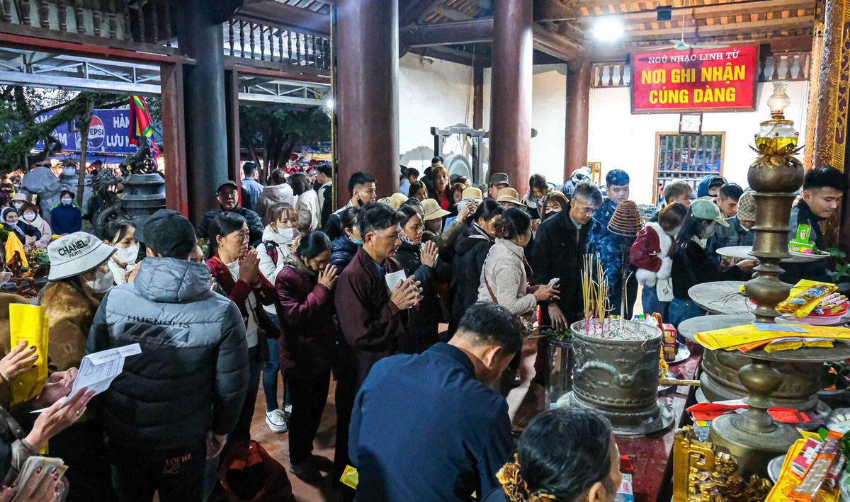 Đền rất đông, mọi người nhốn nháo mãi mới chọn được một vị trí tập kết như ý, sau đó đi bộ khoảng 500m từ bãi đỗ xe đến cổng. Mất 20 phút chen chúc, tôi mới đến được sân đền. Cảnh tượng đầu tiên đập vào mắt là một biển người. Ai cũng khệ nệ mang theo nhiều đồ lễ được sắp sẵn, nhiều người phải đội cả mâm đồ lễ lên đầu để tránh bị xô đẩy. Trong dòng người chen lấn, đi lại hỗn loạn, đoàn chúng tôi phải đi gần lại, bám vào nhau để không bị lạc.