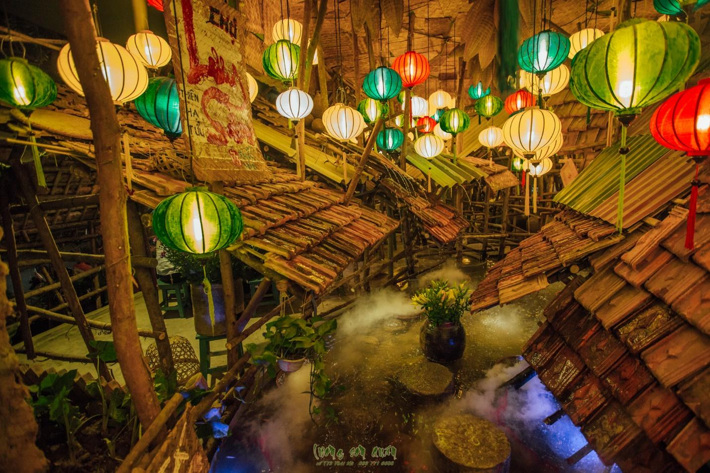 Bước chân vào đây chắc chắc thực khách sẽ bị ngỡ ngàng bởi vẻ đẹp lung linh huyền ảo và đầy thơ mộng với những rừng trúc, thác nước, suối cá, sương khói mờ ảo cùng với vô số đèn lồng được treo trên trần nhà. Đây sẽ là một địa điểm tuyệt vời cho những tín đồ đam mê chụp ảnh và check in. Tiếp đó là khu tầng 2 với phong cách thiết kế hào sảng và mạnh mẽ của quán được đặt tên là “Tụ nghĩa đường”.