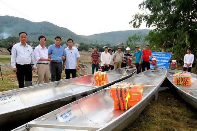 Trao thuyền cứu hộ, cứu sinh và áo phao tại xã Cảnh hóa, huyện Quảng Trạch, tỉnh Quảng Bình - Ảnh: Hi Trang/Vietnam+