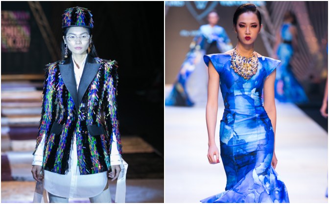 Kikki Lê tựa nàng công chúa bước ra từ biển cả. Được biết, chất liệu chính của bộ sưu tập là vải nhập nguyên khối từ Nhật, được in lên những đường vẽ màu lấy tông xanh dương làm chủ đạo, nhấn nhá với đá cườm, lông vũ và đặc biệt là những khối san hộ thật mang đến từ lòng đại dương. San hô được sử dụng trang trí và tạo điểm nhấn cho áo khoác, mũ,..