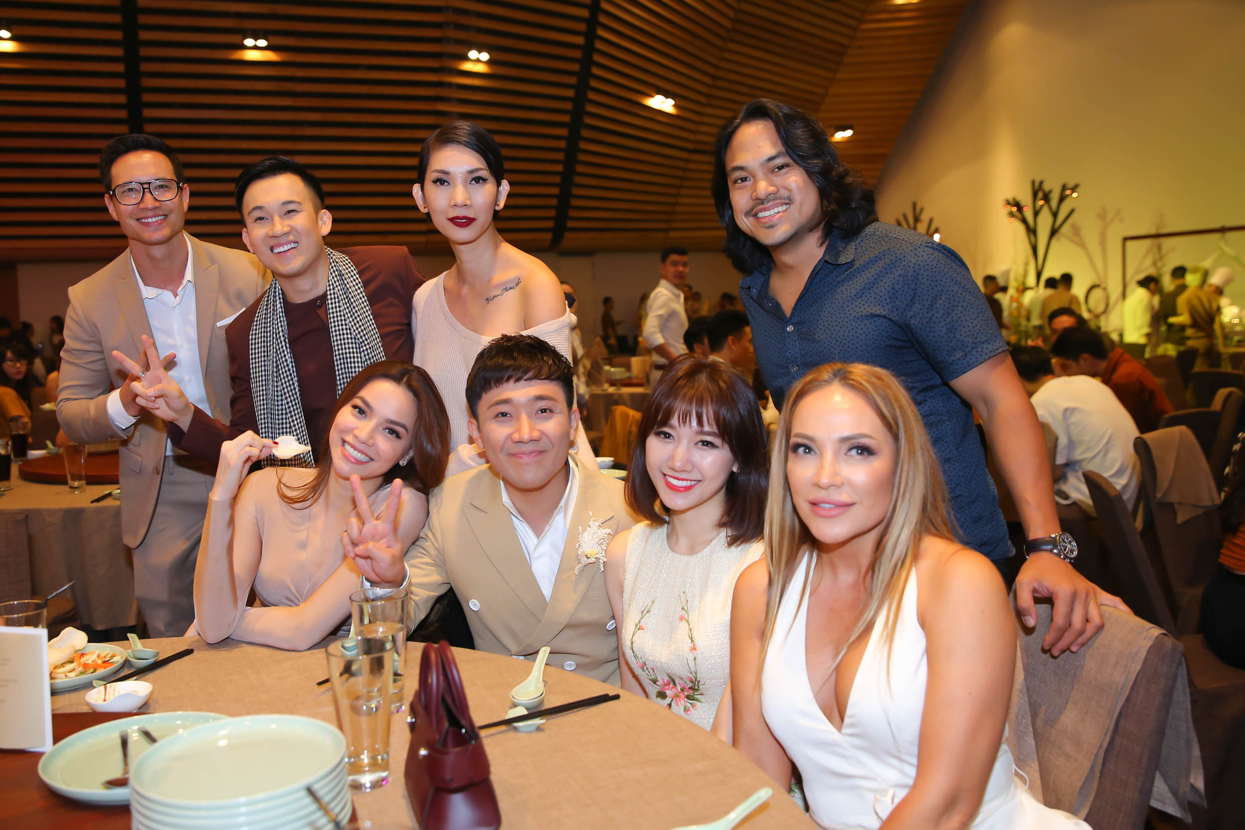 Ca sĩ Thanh Hà và bạn trai kém 12 tuổi (phải), diễn viên Trấn Thành và bà xã Hari Won (giữa, hàng đầu), diễn viên Kim Lý - bạn trai Hồ Ngọc Hà (trái, hàng sau) bên cạnh ca sĩ Dương Triệu Vũ, người mẫu Xuân Lan.