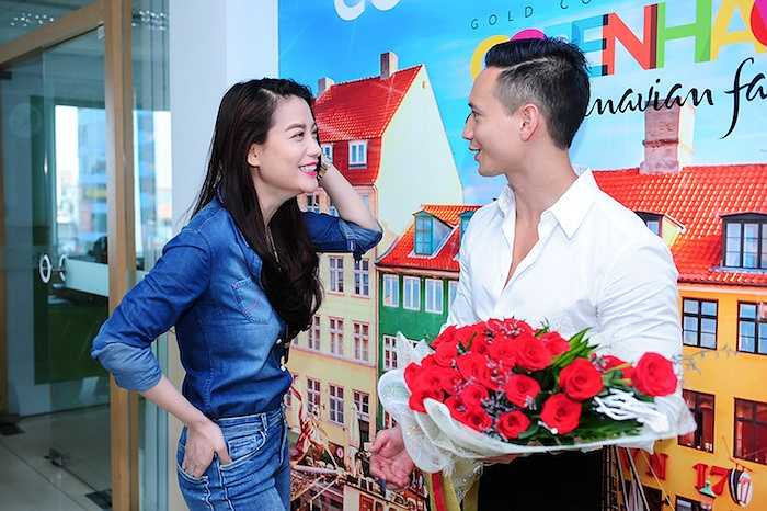 Nam diễn viên Kim Lý ngay lập tức đỏ mặt khi nhận hoa từ 'người tình màn ảnh'.