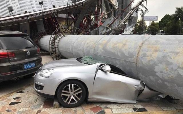 Trận gió mạnh khiến cột biển quảng cáo khổng lồ đổ sập, đè nát hàng loạt ô tô đỗ bên ngoài một tòa nhà ở trung tâm thành phố Đông Hoản, Quảng Đông, Trung Quốc ngày 31/8.