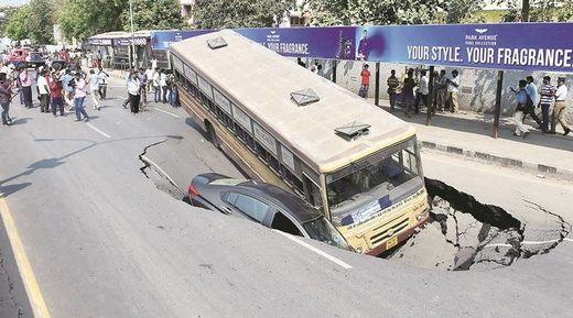 Hố tử thần khổng lồ 'nuốt chửng' xe buýt và xe con trên đường Anna Salai, thành phố Chennai, Ấn Độ hôm 9/4 khiến một vài hành khách bị thương nhẹ.