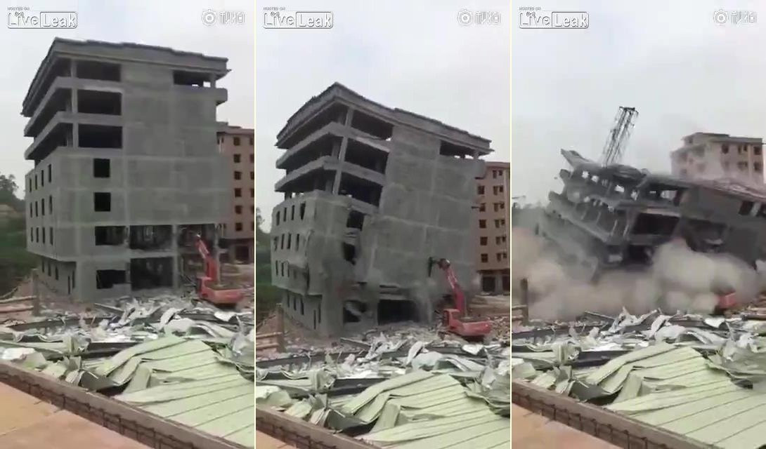 Sự cố khủng khiếp này xảy ra hôm 15/4 tại công trường xây dựng ở thành phố Phật Sơn, tỉnh Quảng Đông, Trung Quốc. Tài xế lái máy xúc may mắn không bị thương.