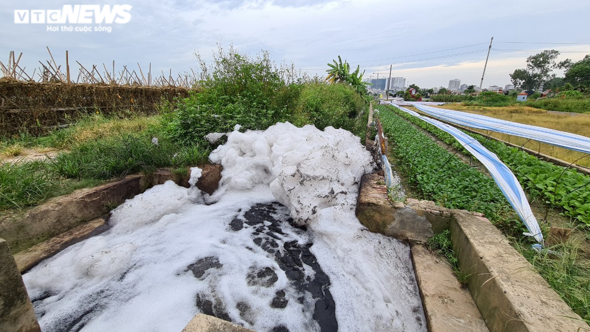 Nguồn nước tưới phục vụ 32 ha rau luôn trong tình trạng đen kịt, bốc mùi hôi thối và bọt tung trắng xóa cả một đoạn kênh tưới.