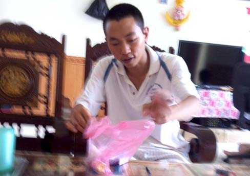 Không dừng lại ở đó, theo quan sát của chúng tôi “thần y” còn kêu bệnh nhân há miệng ra, rồi cho một cái gì đó trăng trắng vào trong miệng. Thấy lạ tôi quay qua hỏi bà Thắm: “Cậu cho cái gì vào miệng người bệnh vậy (?)/ Có gì đâu, đấy chỉ là cái khăn ướt bằng giấy, cái đó cậu dùng để cầm vào lưỡi người bệnh rồi rút lưỡi ra nhè nhẹ”, bà Thắm trả lời.