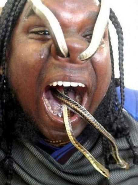 Nhưng chưa dừng lại ở đó, Manu tiếp tục luồn tay vào hộp gỗ tóm ra một chú rắn độc nữa, tiếp tục nhét đầu nó vào mũi còn lại. Hai con rắn ngo ngoe, với đuôi thò ra đằng mũi, đầu thò ra đằng miệng Manu khiến bất kỳ ai có mặt cũng phải sợ hãi.