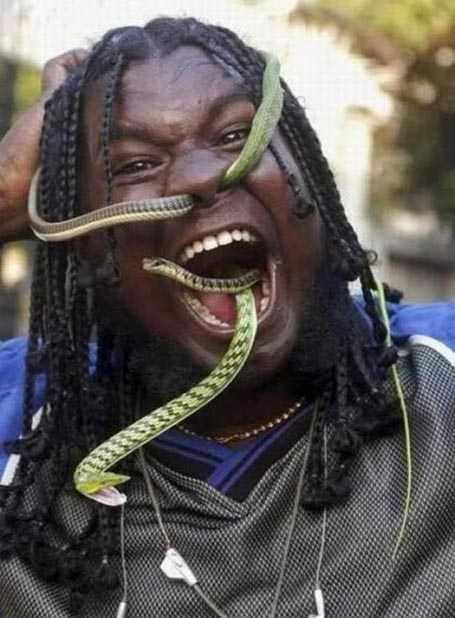 Không chỉ bắt những con rắn chui vào đằng mũi, bò ra đằng miệng, mà Manu còn bắt nó chui vào miệng và phải tìm đường ra lối mũi. Chú rắn độc thò đầu ra khỏi mũi, há miệng thở phì phò thật đáng sợ.