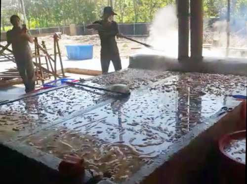 Lòng lợn được trộn với hóa chất trong bể xi măng
