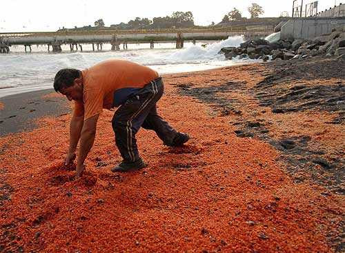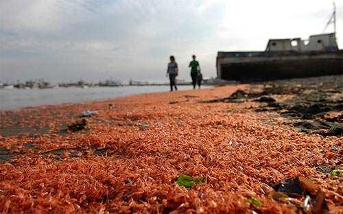 Hình ảnh bờ biển đỏ rực vì xác tôm cua:
