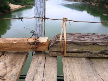 Dây chun, dây lạt... được dùng để buộc thanh gỗ lan can cầu